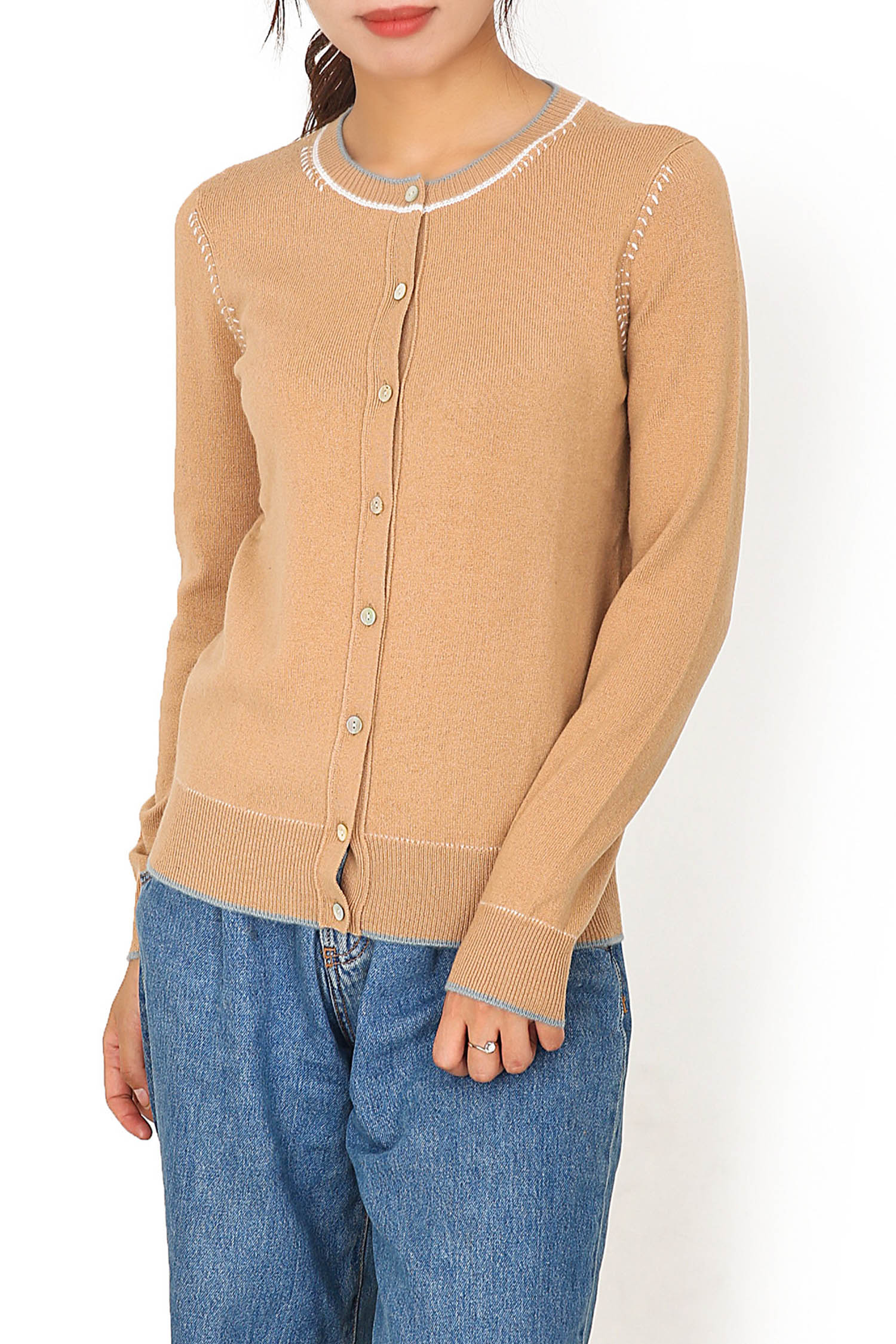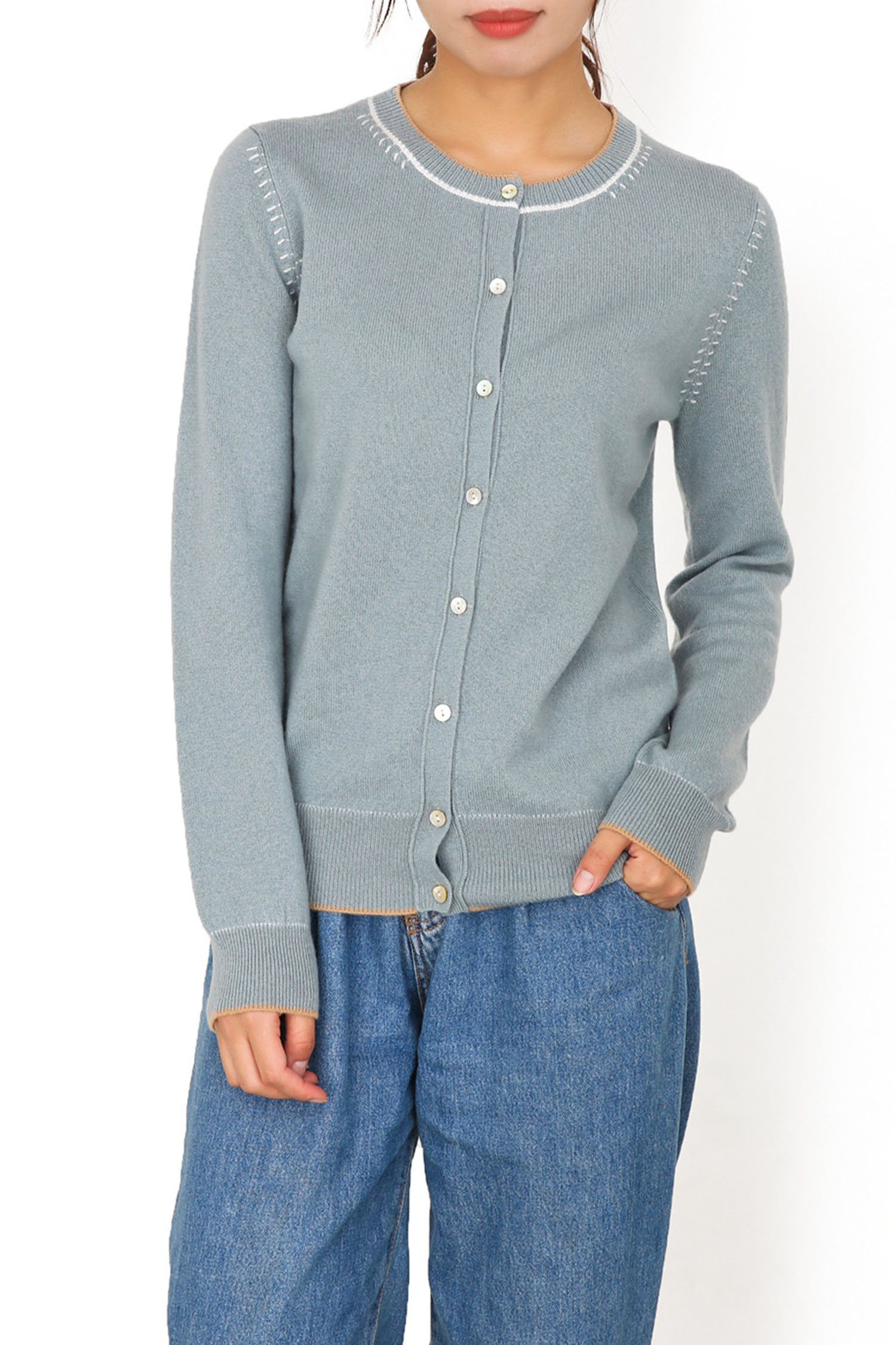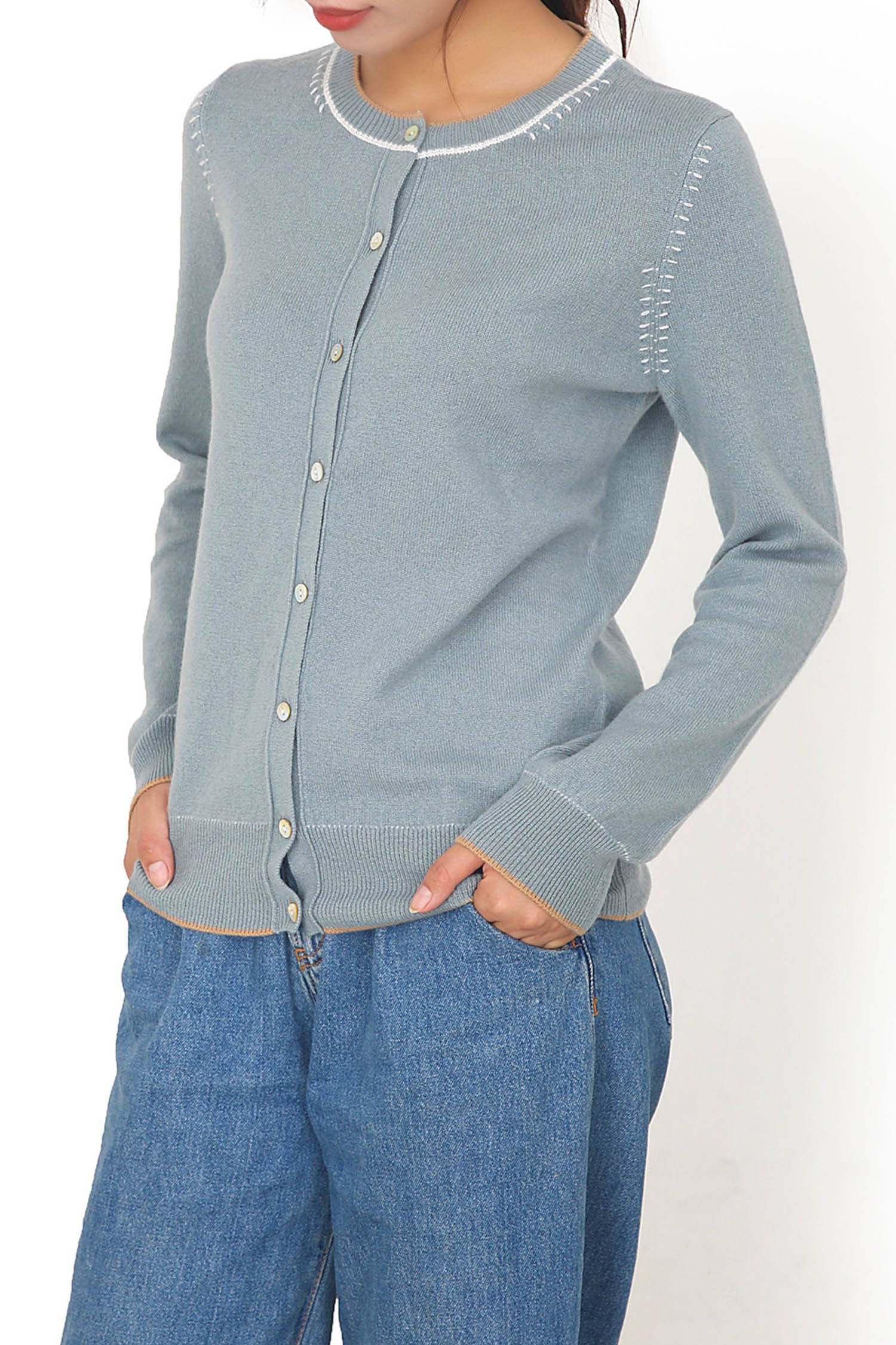 | Description | Crew Neck Plain Button Cardigan with Hand Stitch Decoration 12GG |