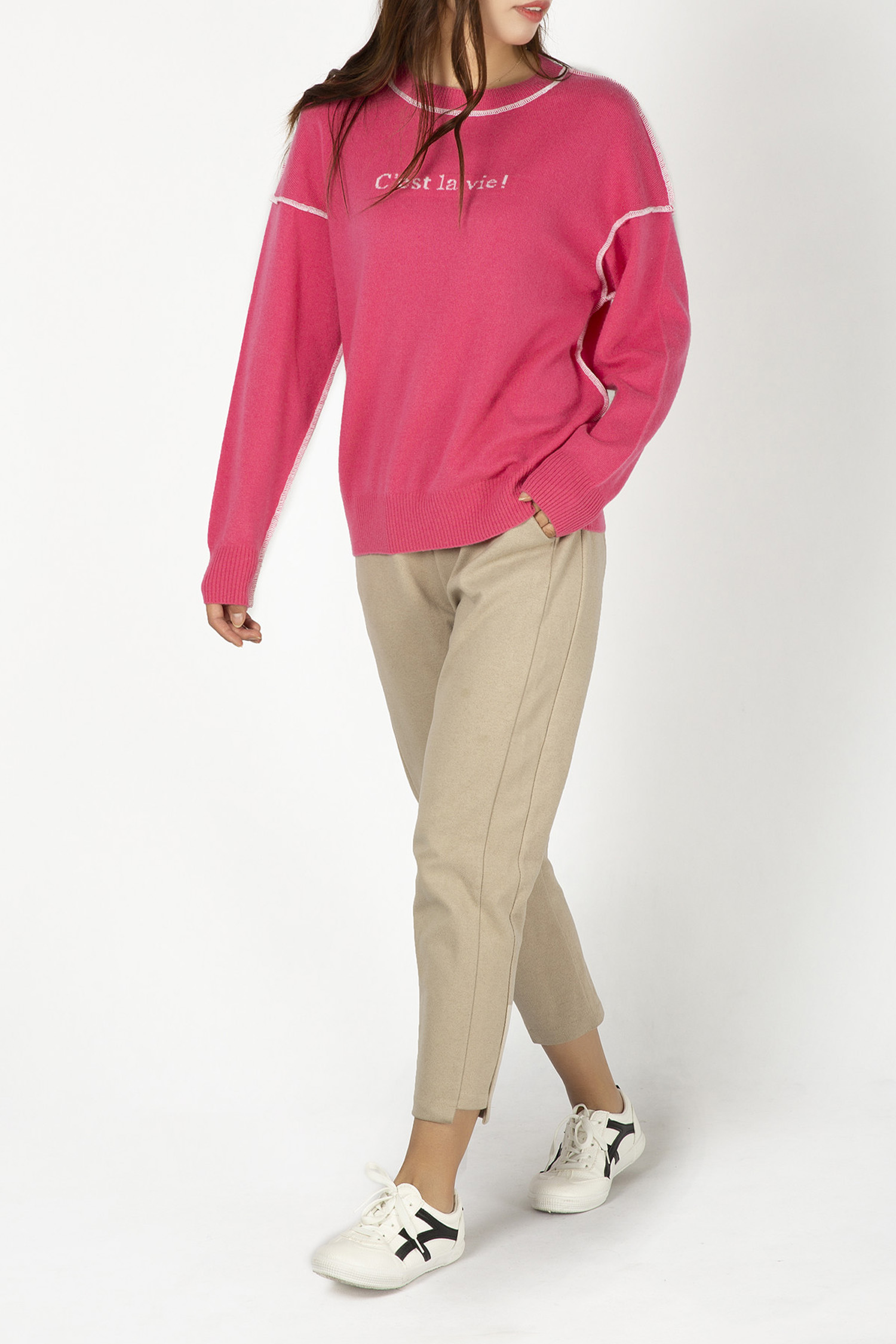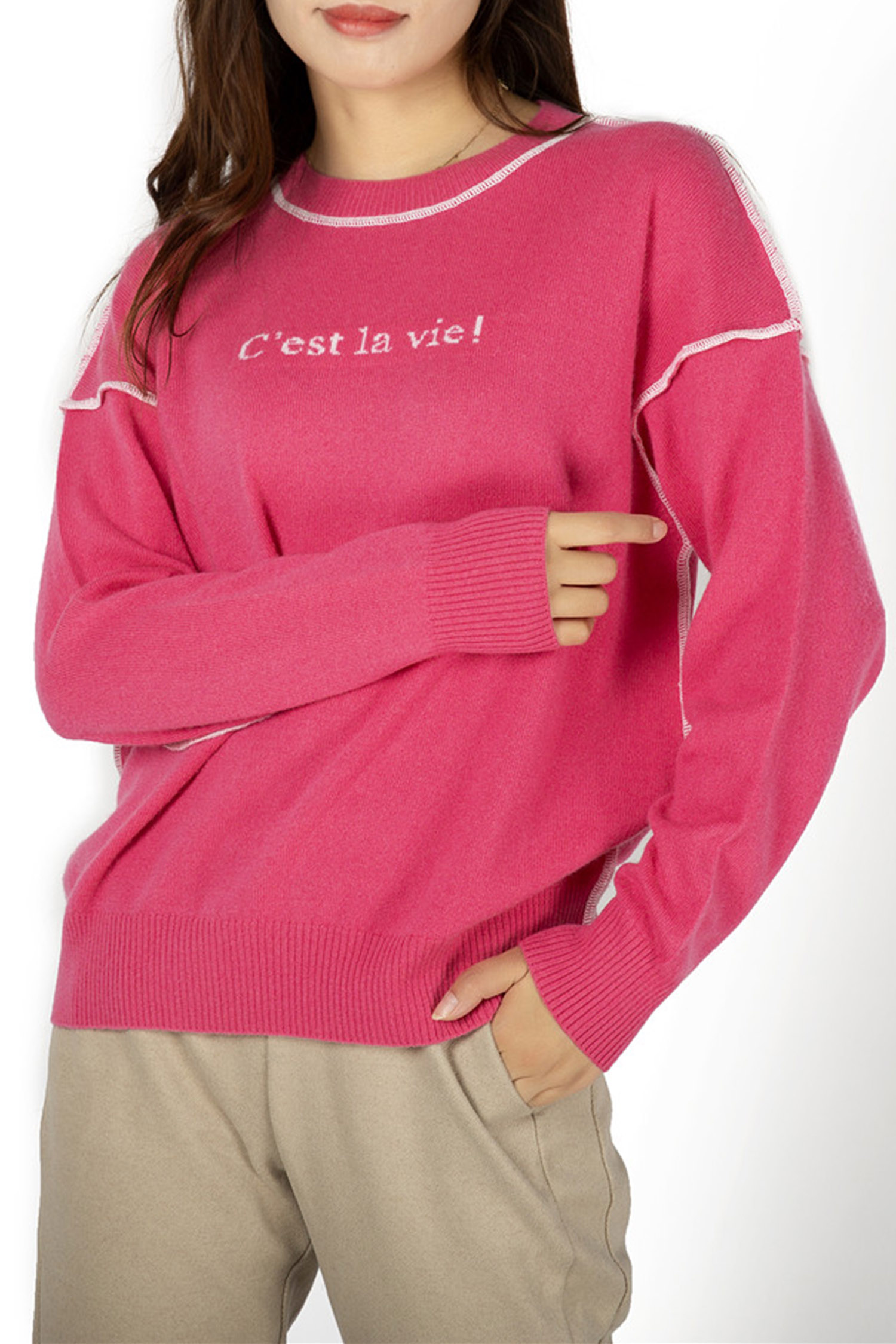 | Description | Crew Neck Plain Knit Sweater with Jacquard Wording 12GG |